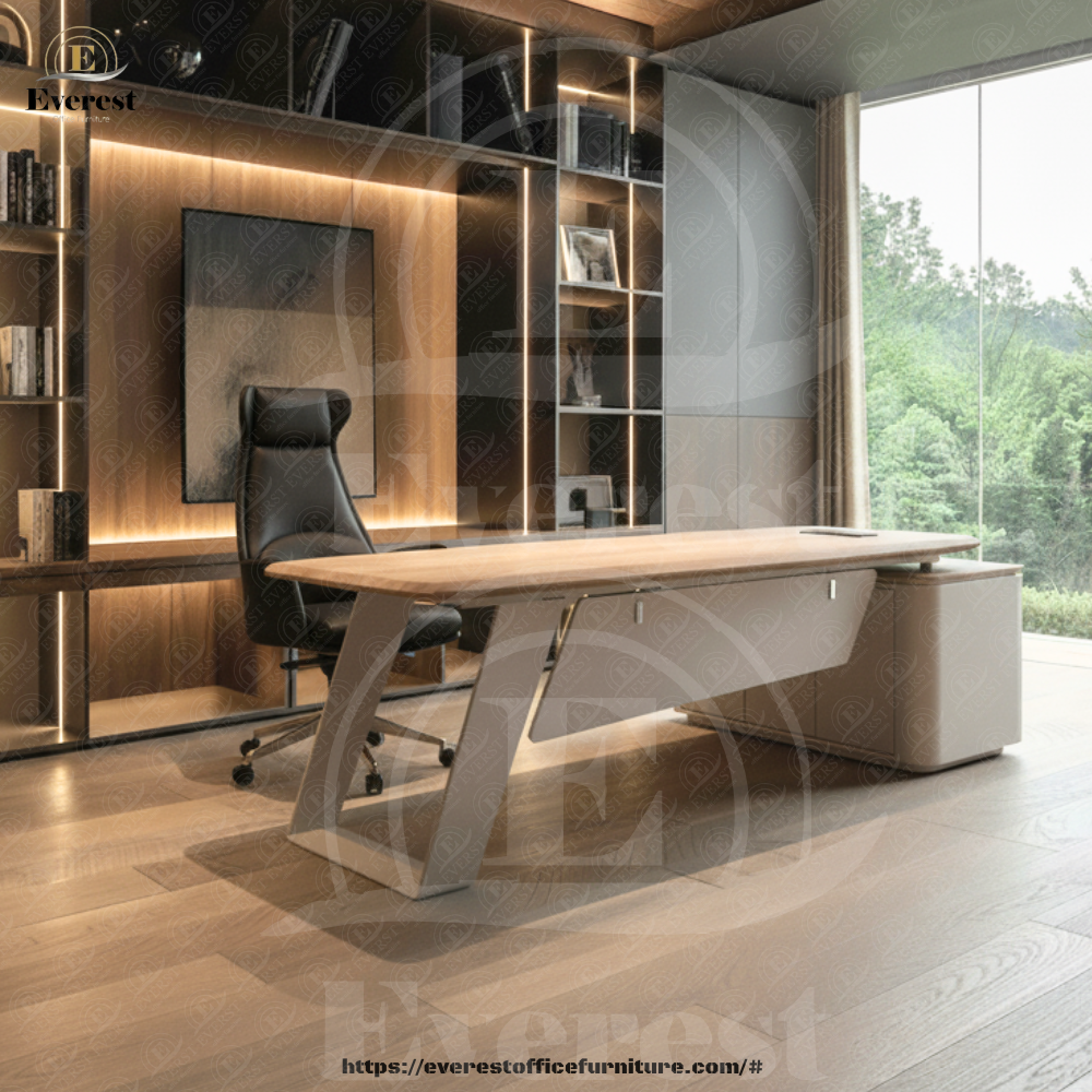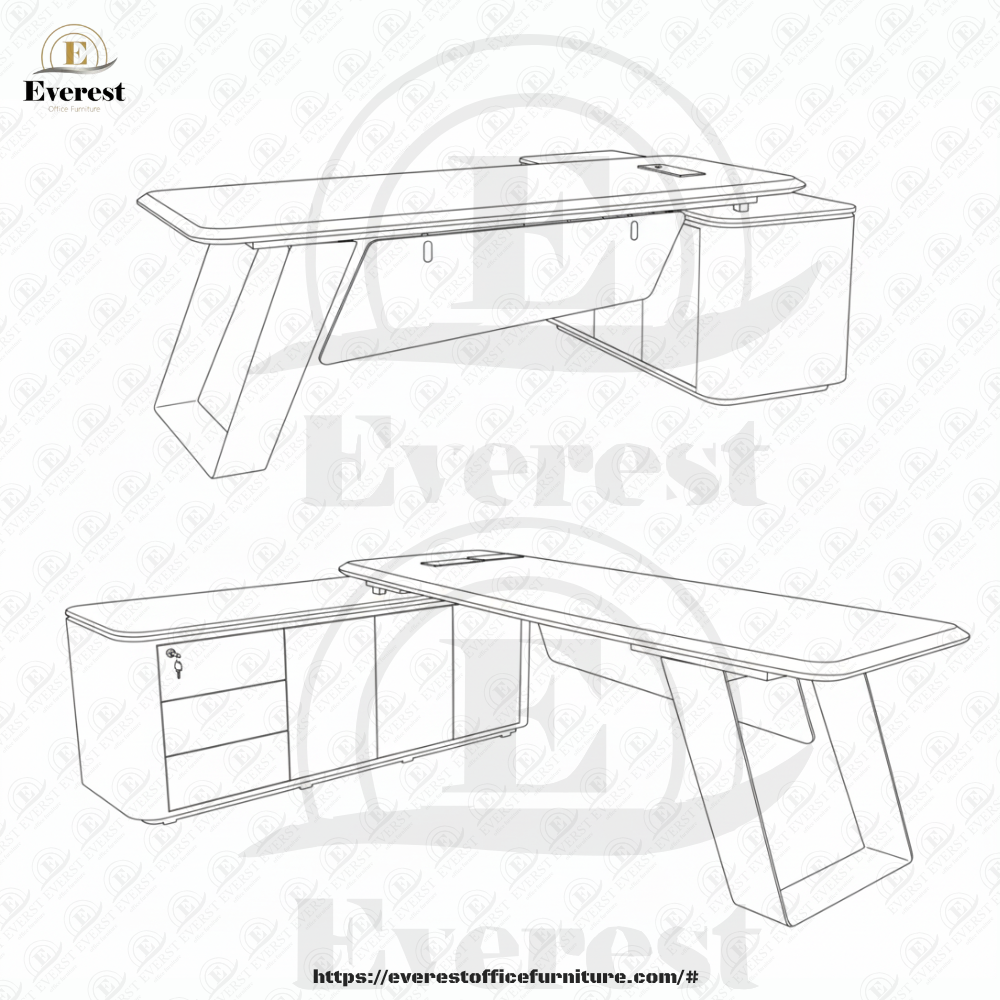 | مكتب مدير علي شاسيه معدني مميز دهان الكتروستاتيك مقاوم للصداء+قرصه خامة pvc مزود بطبة اسلاك data ومرتكز علي سايد محتوي علي وحده ادراج تاتش+2دلفه سوفت كلوز |